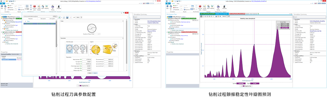 · 針對用戶(hù)設定的切削條件、刀具幾何形狀、工件材料、工件和機床結構特性,對鉆削過(guò)程中的顫振穩定性、切削力、主軸扭矩和功率進(jìn)行仿真預測;